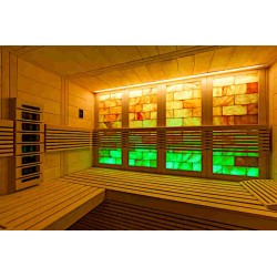 Le chauffage est assuré par un poêle de 6 kW ainsi que par un émetteur infrarouge de 350 W. Le fond du sauna dispose d'un mur de sel rétroéclairé par des LED de couleur. Le sel a non seulement une fonction esthétique mais il est surtout la base de l'halothérapie ou soins par le sel.